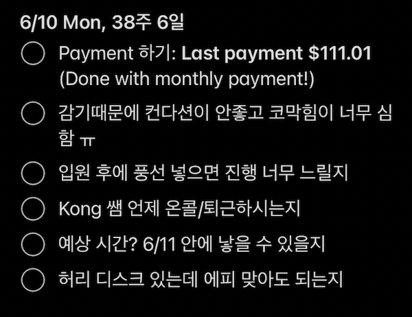 모유수유를 원하는지도 질문 목록에 있었고, 에피듀럴(무통주사) 맞을 거냐고 해서 YES 했다.